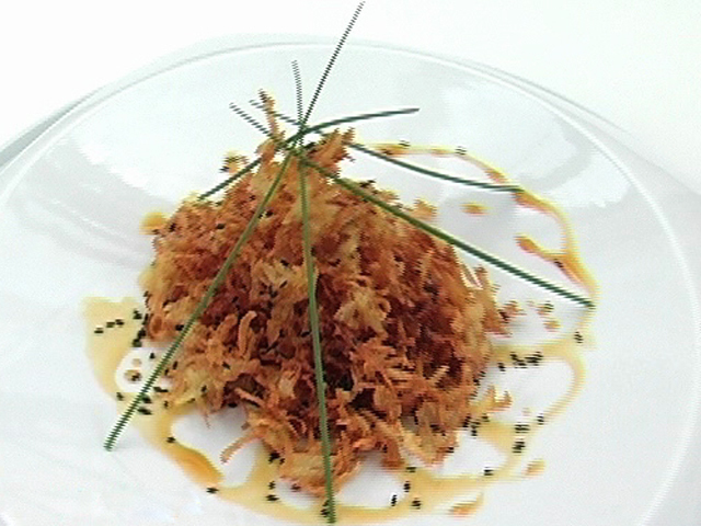 Блюдо японской кухни из картофеля.Состав:картофель — 1 штука;лук — 1/2 штуки;мука — 3 столовых ложки;яйцо — 2 штуки;кунжут — 20 гр;вода — 100 гр;кукурузный крахмал — 1 столовая ложка;кунжутное масло, соевый соус, растительное масло — по вкусу.